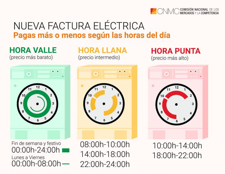 Por ejemplo, de lunes a viernes se considera valle el horario que va de 00:00 a 08:00 h; entre las 10:00–14:00 h y 18:00–22:00 h suele aplicarse el tramo punta; y las demás horas son llano. En sábados, domingos y festivos el día completo suele considerarse valle.Consumir más en la franja valle (por ejemplo con programas automáticos de lavadora o vehículo eléctrico) puede suponer un ahorro cuantificable en la factura.